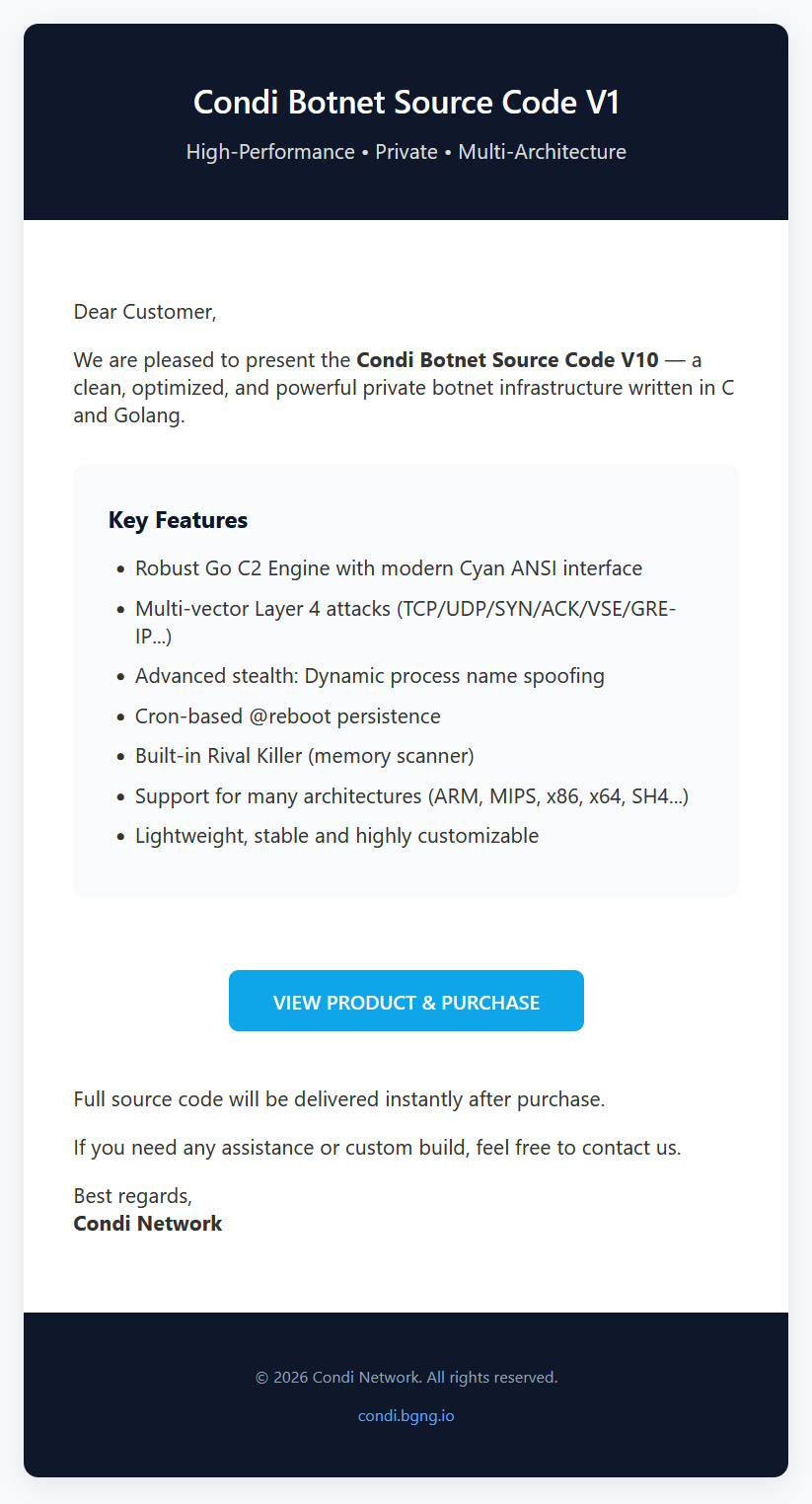 The click through web address: https://condi.bgng.io/product/condi-botnet-source-code-v1- is where your card details could be harvested and/or malicious code ends up being downloaded to your device.