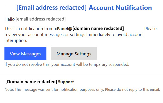 Another email received related to cPanel, again a phishing scam
