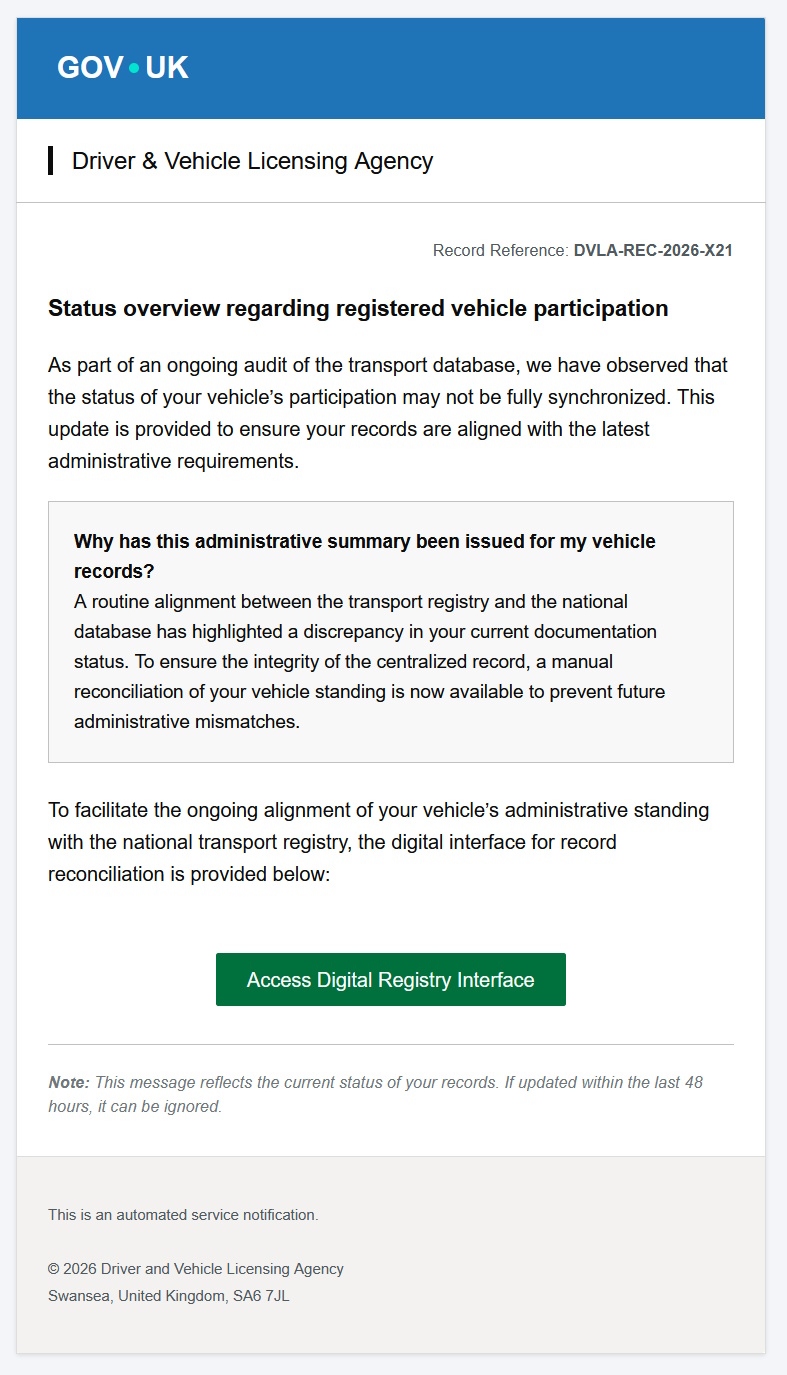 Using overly formal language, almost unintelligable this DVLA phishing scam is attempting to obtain your personal details, most likely credit card details. The sender email address uses a Brazillian country domain name extension, unlikely for a Welsh based UK organisation...