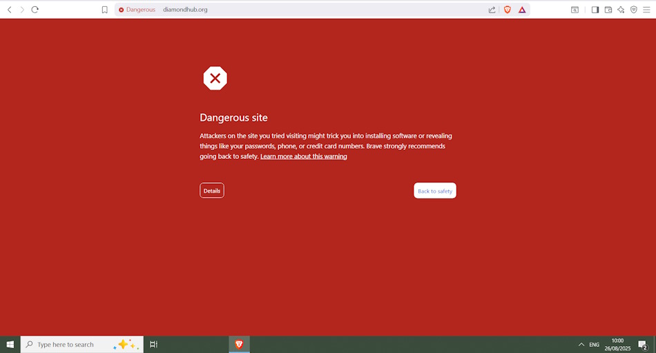 - Click through website address: https://diamondhub.org/wp-admin/mail.html#[Email address redacted]. An unlikely address for an isp (internet service provider) and the parent domain https://diamondhub.org has a warning on the site...
