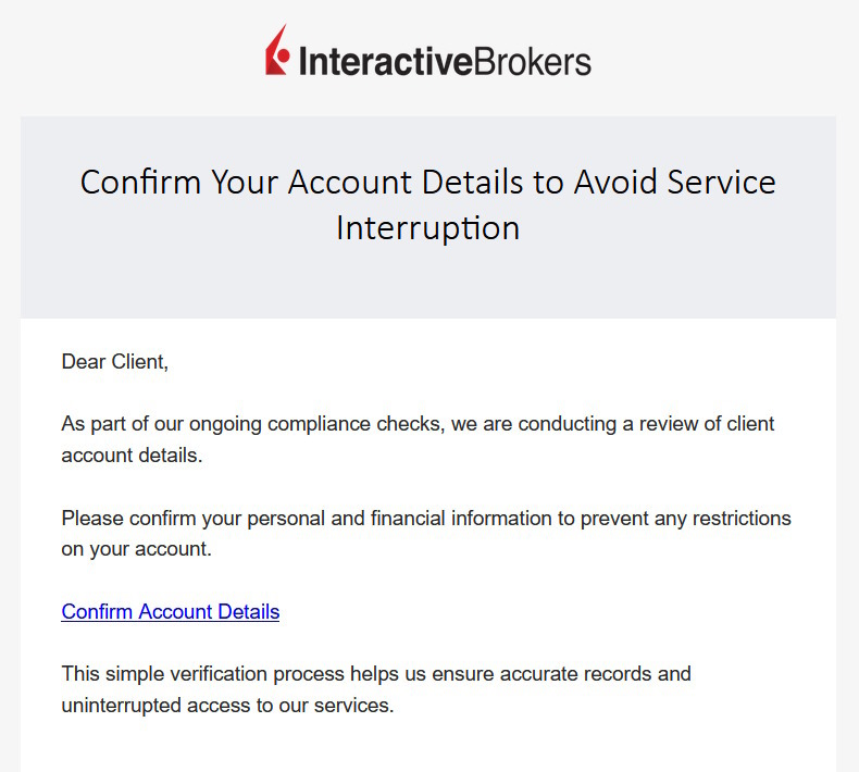 We received another email from scammers pretending to be Interactive Brokers, again wishing you to click on a link and go to a fake page.