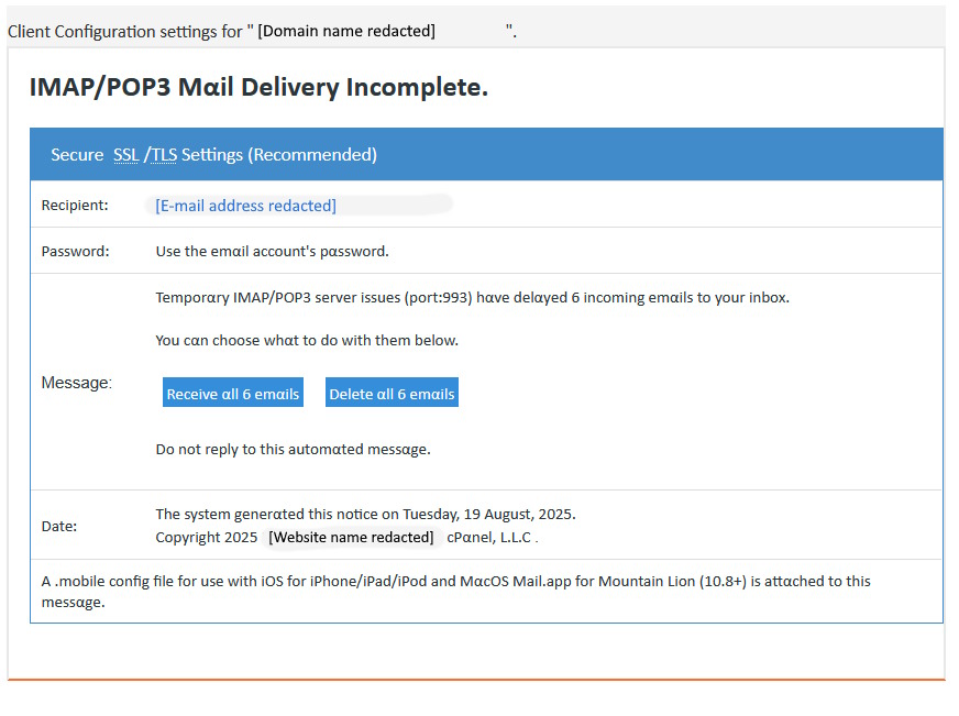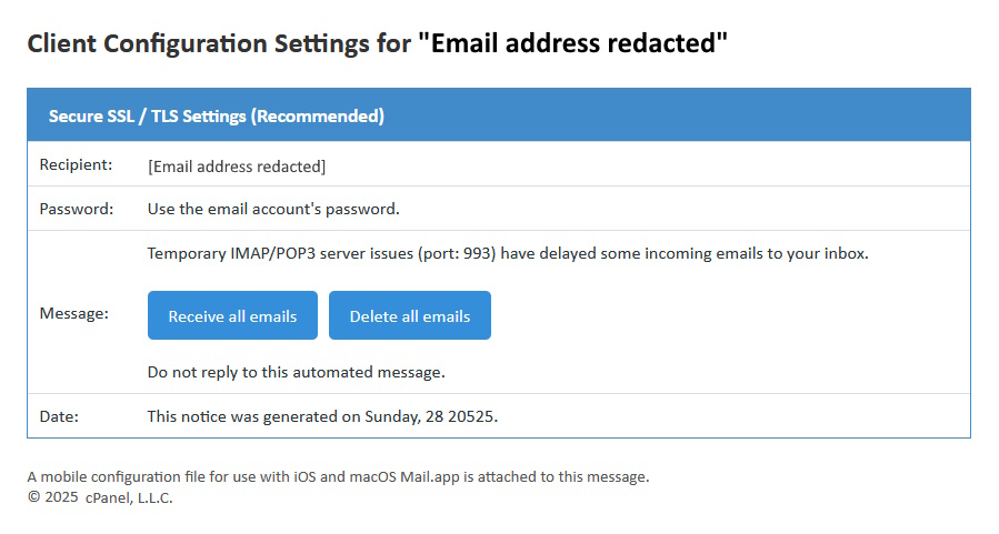 Well laid out email appearing to be a message from your cPanel telling you of email delivery difficulties. The sender email address has been spoofed to appear to come from your domain name.