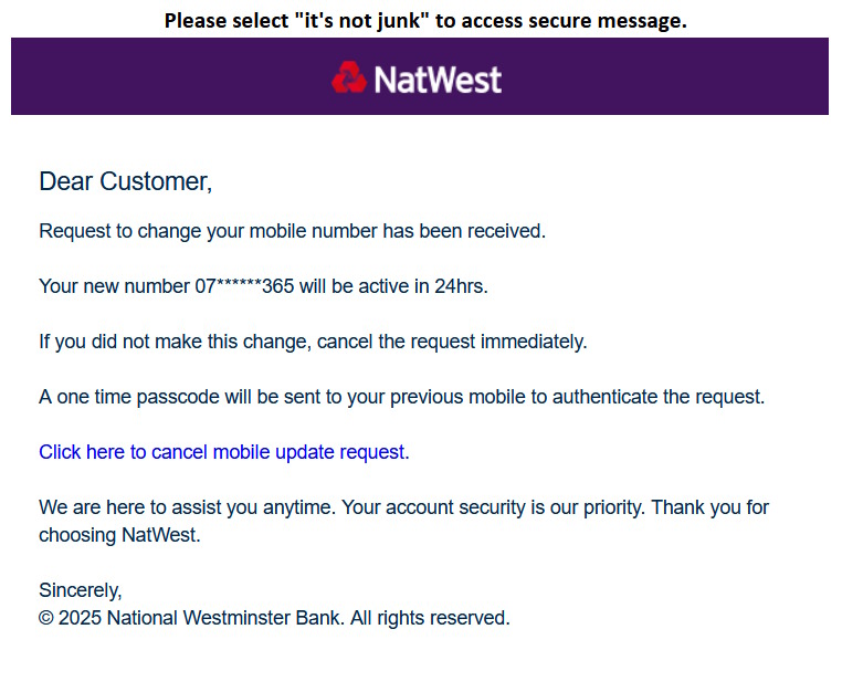 If you have a bank account with Nat West this might alarm you thinking some unknown person is trying to change your contact phone number (the one you receive one time passwords) But don't jump to cancelling the phone number change. This email is not personally addressed to you, just to "Dear Customer", the email could be sent to hundreds of recipients telling them of the same mobile phone change also they will not have sent any notification to your present number as they don't know it.