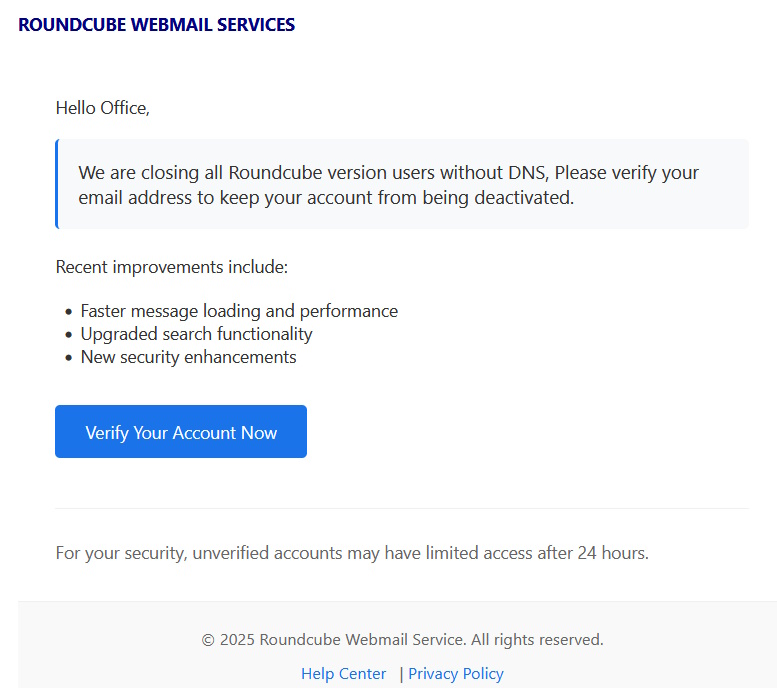 In this phishing scam Roundcube (the webmail provider) claims to be contacting you with an urgent resoltion required for an email blockage... more >>