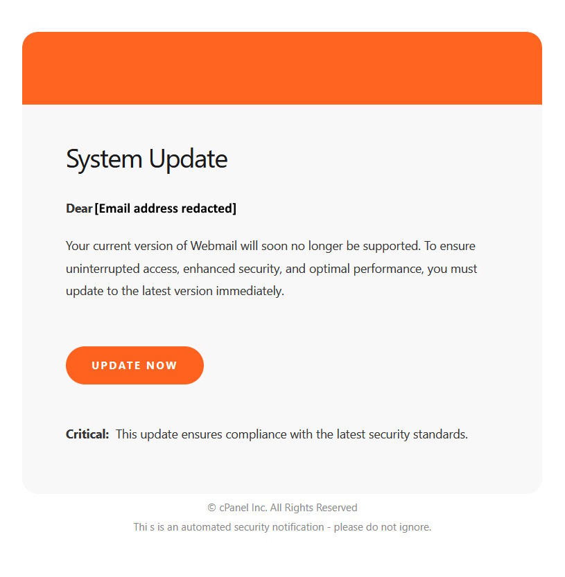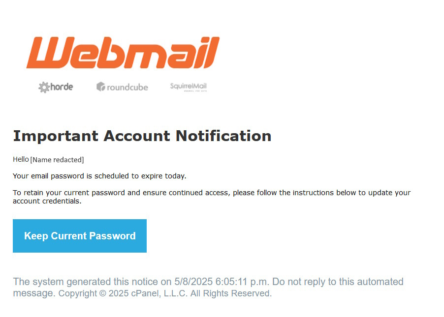 One of my e-mail addresses was targetted with a quick succession of emails claiming my webmail password was due to expire and that I had to update it by clicking on the link(s) which took you to a copycat of an actual cPanel Webmail login page where your login details could be "harvested".