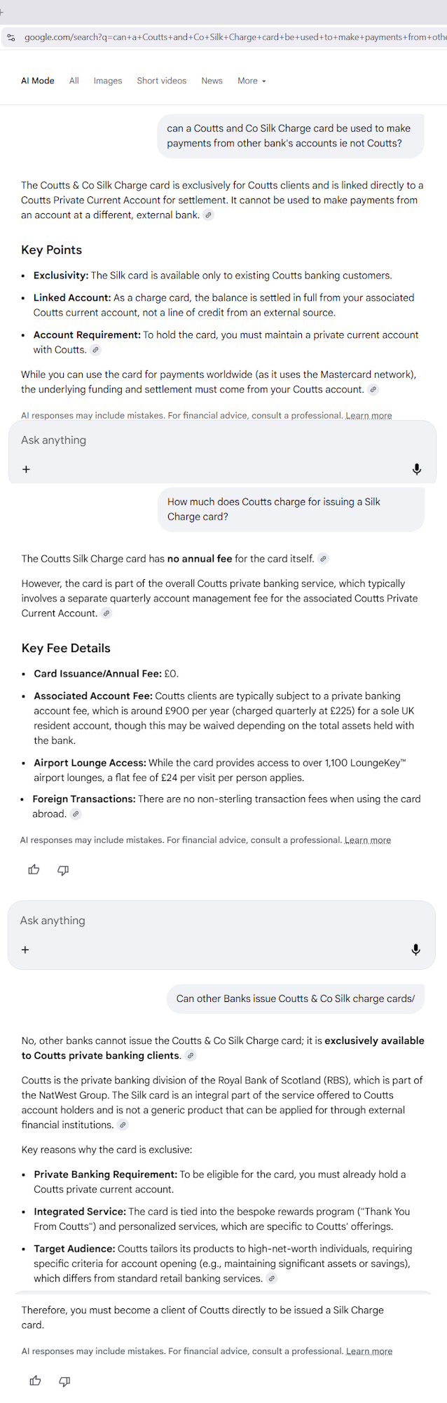The Foreign Operations/Transfer Manager Online Banking Unit (a very grand title) said to be one Mngr. Spencer Frederic would not be able to purchase a genuine Coutts & Co Silk Charge card for these reasons as explained in more detail on the Google AI search report below: