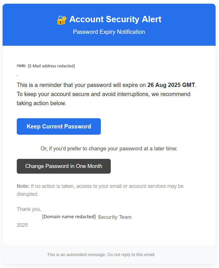 Two days later we received an identical email except the expiry date was "28 Aug 2025 GMT". In this case the sender email address was florayuen@viribright.com.hk (a Hong Kong domain name), the click through website address was the same as the previous email.