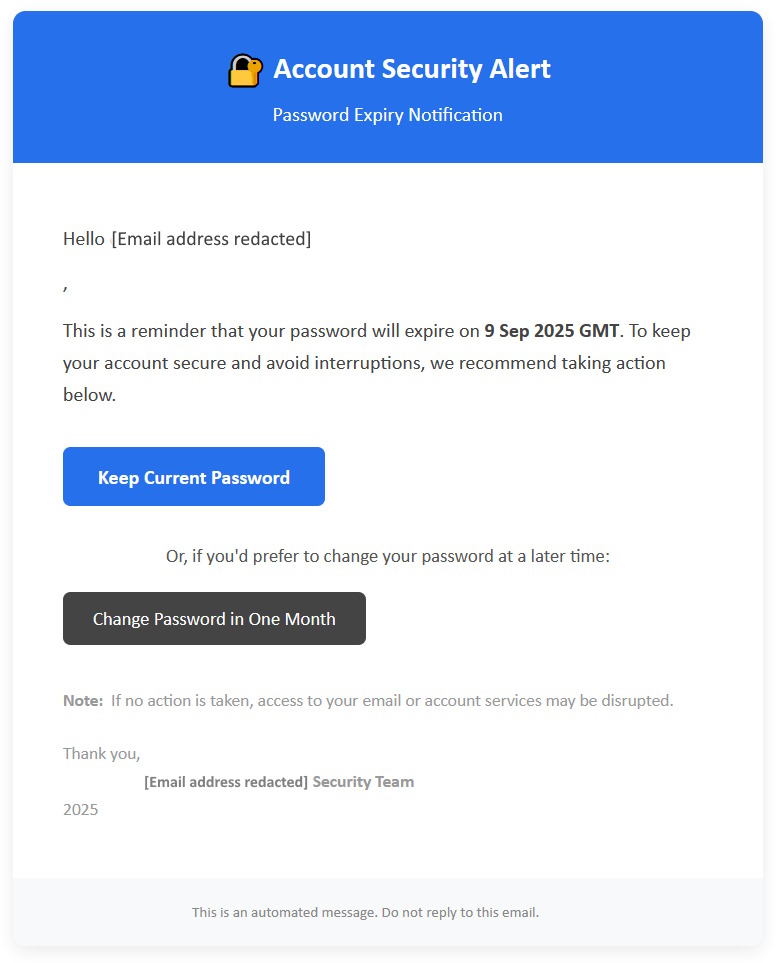 Your password is due to expire. The "Security Team" need you to login to your account now.