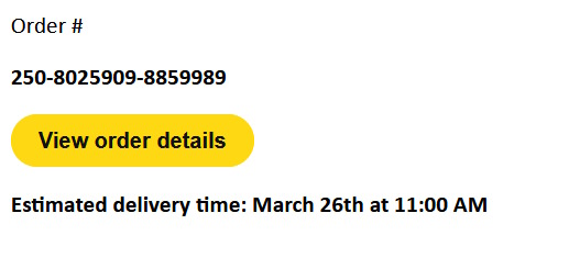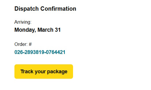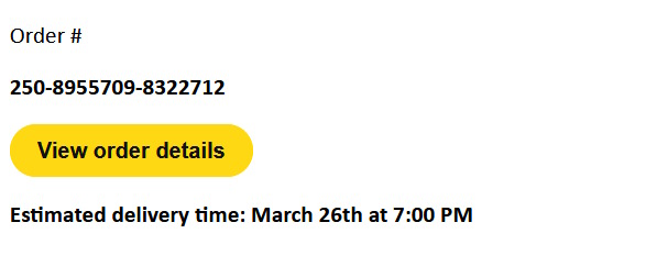 Link addresses, clicking the yellow "view you order" or "track your package" do not take you to a genuine Amazon website but to these addresses... https://amazon.813wl.com/shipping.amazon.com/, https://amazon.rtqgj.com/shipping.amazon.com/, https://amazon.szmkx.com/shipping.amazon.com, https://amazon.51jsa.com/shipping.amazon.com.