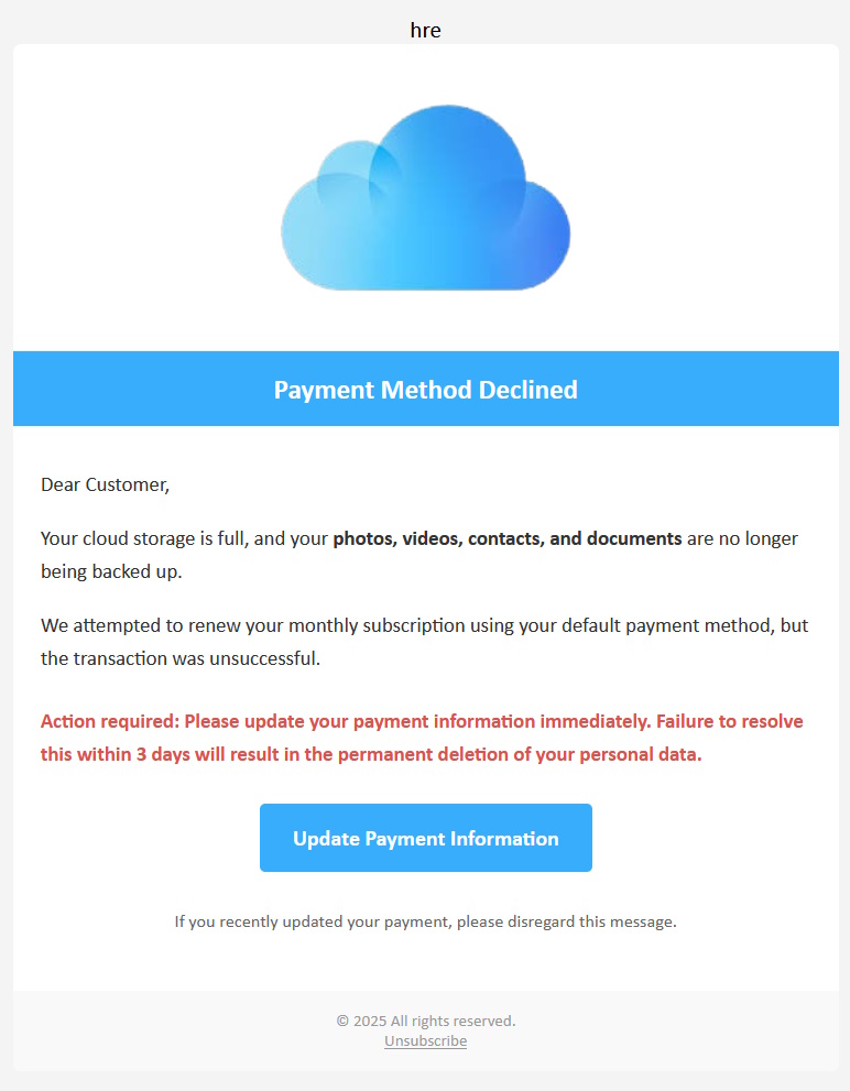 Cloud Storage Payment Declined Phishing Scam