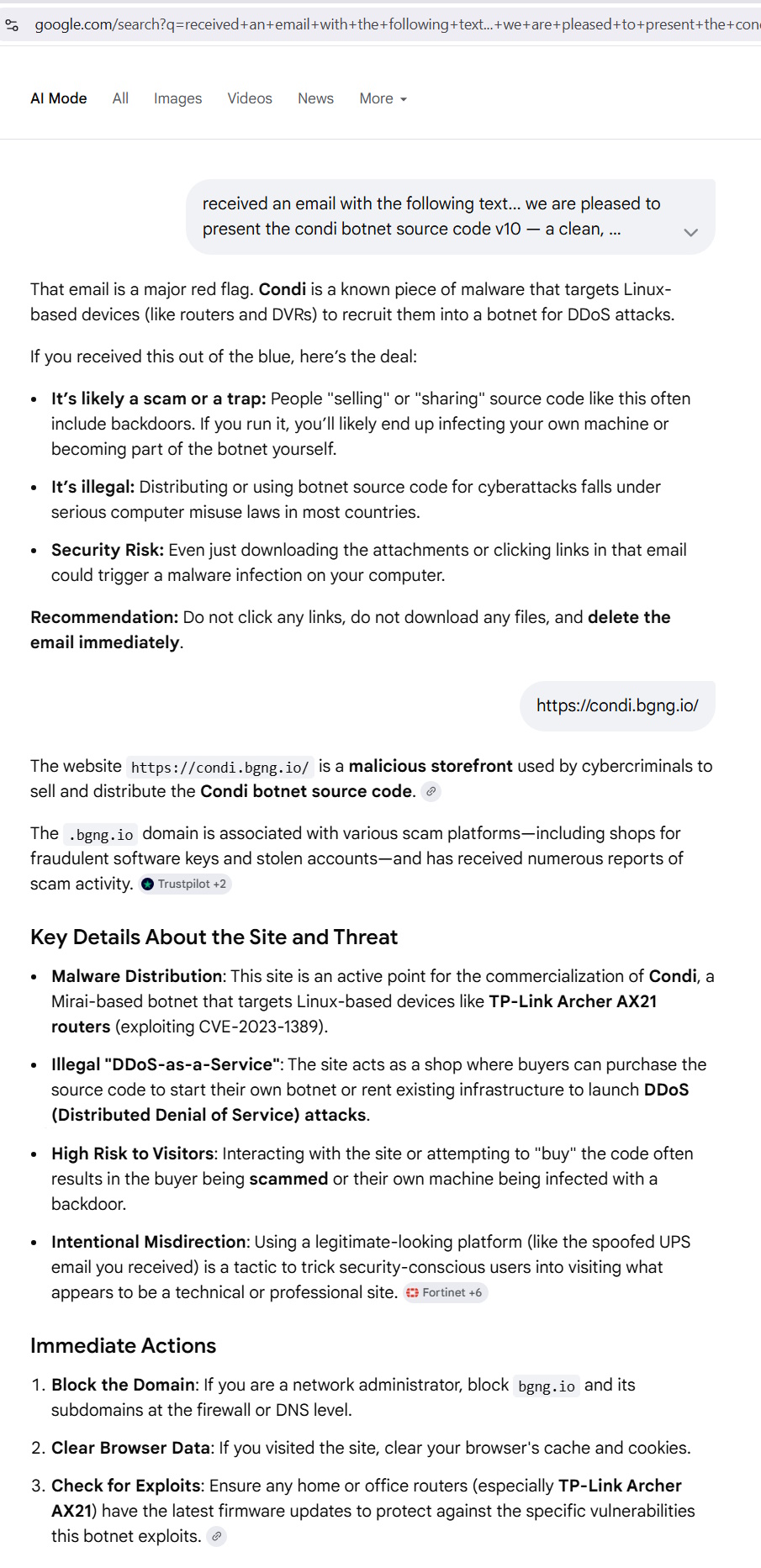 The click through web address: https://condi.bgng.io/product/condi-botnet-source-code-v1- is where your card details could be harvested and/or malicious code ends up being downloaded to your device.