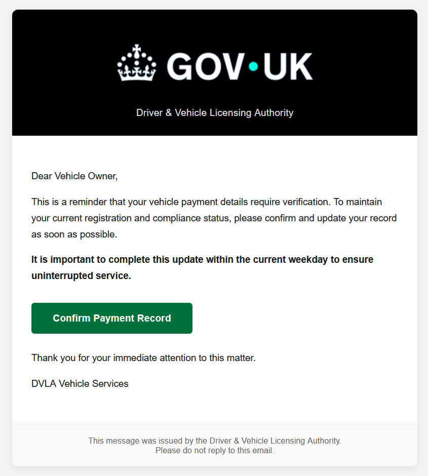On first glance this email appears to have come from DVLA the Driver Licencing Authority in the UK but examine the sender email address, inconsistencies in the email and the click through web address and this is a scam email designed to capture your bank debit card details.