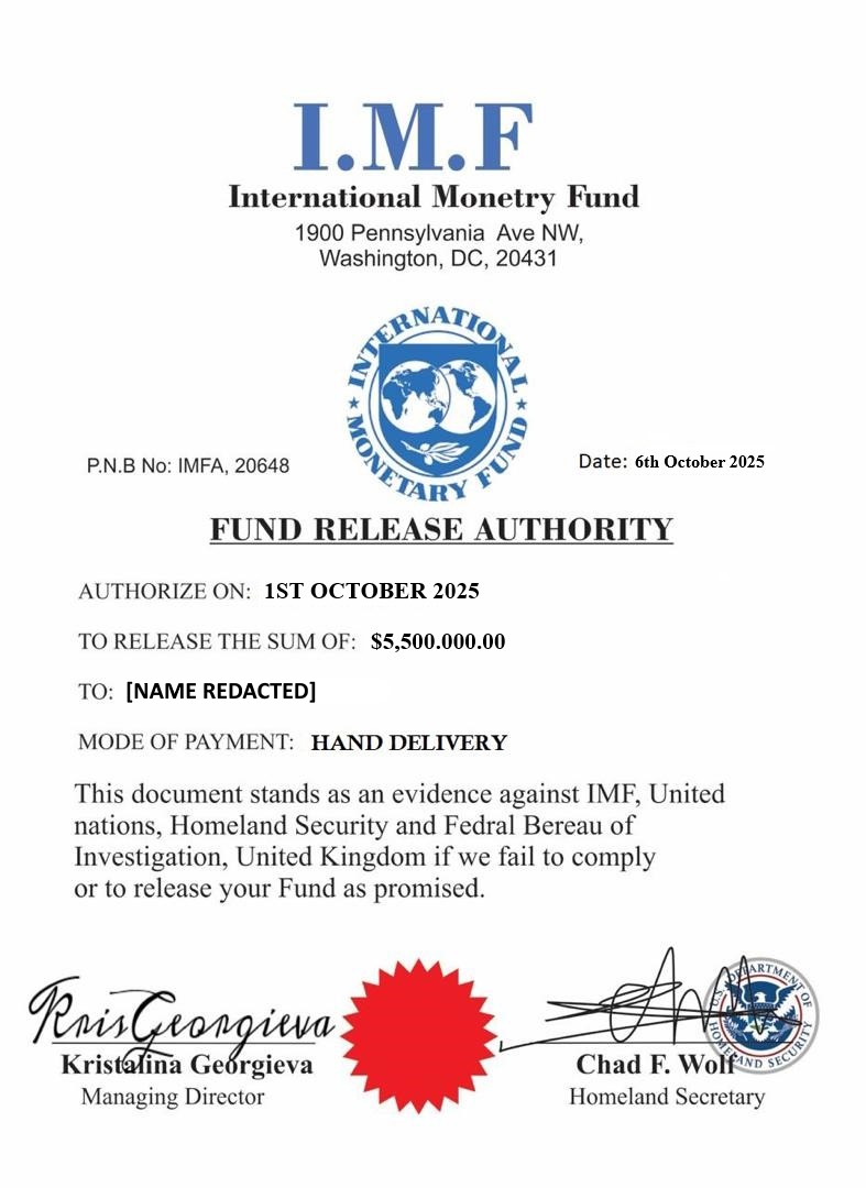 We are done with your clearance process and your funds valued the sum of Five Million Five Hundred Thousand United State Dollars ($5, 500, 000.00) has been packaged in a Consignment Box, We have received a letter from the bank in charged that your funds box has been deposited with the UN Courier Company to delivered it to your home address on Thursday October 2nd 2025 with the help of UN Diplomat Staff (Gian Martins).