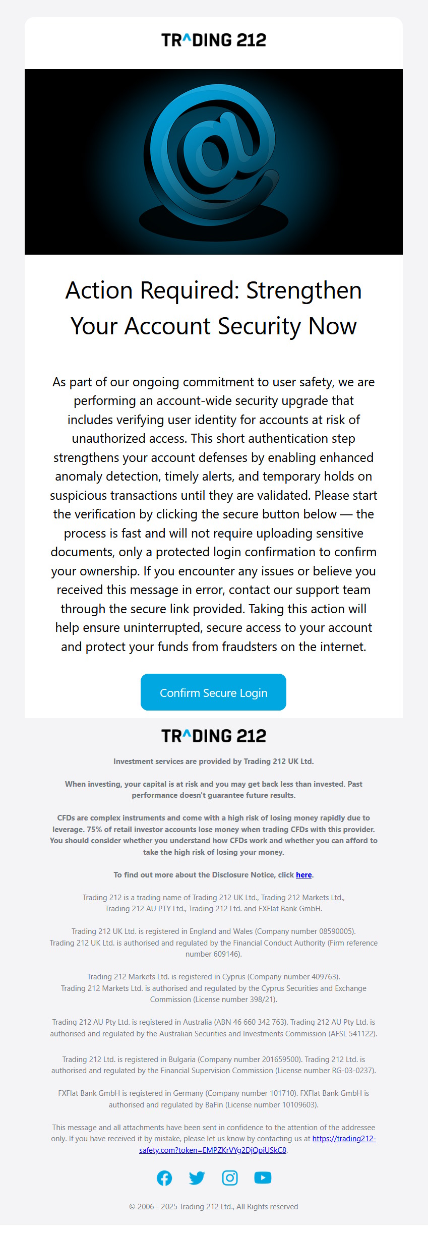 Phishing Scam email purporting to be from the Trading212 Investment platform. Usual "red flags" unusual sender email address, click through web address and the sense of urgency being instilled, but take a few minutes to think before you act...